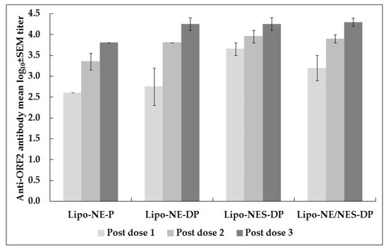 Anti-ORF2 antibody mean log10 titers in monkeys immunized with Lipo-NE-P (MM 420 and 423), Lipo-NE-DP (MM 407 and 408), and Lipo-NES-DP (MM 417 and 419) vaccine candidates. The last horizontal x axis data point (Lipo-NE/NES-DP) shows successive mean log10 titers following each dose calculated for the four monkeys (MM 407, 408, 417, and 419 immunized with Lipo-NE/NES-DP). Antibody titers were determined 4 weeks after each of dose 1, dose 2, and 2 weeks after dose 3. Error bars represent standard error of the mean (SEM) of log10 titer.