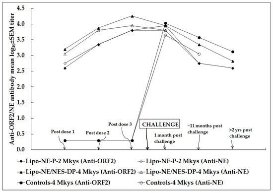 At 1 month, 11 months, and 2 years and 3 months following challenge, the anti-ORF2 (NE) antibody GMTs/mean log10 ± SEM titers in monkeys immunized with Lipo-NE-P were 9051.0/4.0 ± 0.2 (6400.0/3.8 ± 0.0), 565.7/2.8 ± 0.5 (565.7/2.8 ± 0.2) and 400.0/2.6 ± 0.3, respectively. At the same post-challenge time-points, the anti-ORF2 (NE) antibody GMTs/mean log10 ± SEM titers in monkeys immunized with Lipo-NE-DP and Lipo-NES-DP were 9051/4.0 ± 0.2 (6400/3.8 ± 0.0), 1600/3.2 ± 0.0 (1131.4/3.1 ± 0.5), 565.7/2.8 ± 0.2, and 9051/4.0 ± 0.2 (6400/3.8 ± 0.3), 3200/3.5 ± 0.3, 800/2.9 ± 0.3, respectively. Similarly, the anti-ORF2 (NE) antibody GMTs/mean log10 ± SEM titers calculated for four monkeys representing two immunization groups were 9051.0/4.0 ± 0.1 (6400.0/3.8 ± 0.1), 2262.7/3.4 ± 0.2 and 672.7/2.8 ± 0.1, respectively (Table 2). The kinetics of the anti-ORF2/NE antibody mean log10 titers at cardinal time-points in monkeys immunized with Lipo-NE-P (MM 420 and 423) and Lipo-NE/NES-DP (MM 407, 408, 417, and 419) vaccine candidates along with experimentally infected control monkeys (MM 421, 422, 427, and 428) are shown in Figure 4.