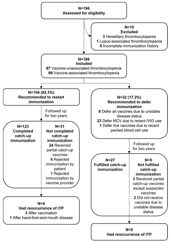 To harmonize management across the team in the Immunization Advisory Clinic, a practical protocol for immunization recommendation for children with ITP was developed after a review of the literature and current guidelines [,,,]. Children with ITP are recommended to restart or resume immunization when this disease has been in remission for at least 3 months. If it has been recommended that live vaccines should be withheld, the parents will be informed of the vaccine type and interval according to the blood product and immunosuppressive therapy used. It is recommended that live vaccines (bOPV, MCV, JEV-L, and varicella vaccines) should be withheld in the following scenarios []: (1) at least 30 days after discontinuation or tapering of corticosteroid use when using corticosteroids at a dose of ≥2 mg/kg per day of prednisone or its equivalent, or ≥20 mg per day if the weight is ≥10 kg for 14 consecutive days or more; (2) at least 14 days after discontinuation or tapering of corticosteroid use when having administered corticosteroids at a dose of ≥2 mg/kg per day of prednisone or its equivalent, or ≥20 mg per day if the weight is ≥10 kg for less than 14 consecutive days or at a dose of <2 mg/kg per day; and (3) 3 months after having administered cyclosporine at ≥2.5 mg/kg per day or mycophenolate mofetil at ≥30 mg/kg per day. It is recommended that live vaccines of the MCV and varicella vaccines (VarVs) should be deferred at least 6 months after transfusion of packed red blood cells or whole blood, 7 months after plasma or platelet cell transfusion, 8 months after therapy consisting of intramuscular or intravenous immunoglobin (IVIG) administration at a total dose of 400 mg/kg, or 10 and 11 months after total doses of 1000 and 2000 mg/kg, respectively, for the previous treatment. The children were vaccinated at their local community immunization clinics. We conducted active telephone follow-ups and passive surveillance based on parents’ self-reports to monitor relapses of ITP following immunization. A relapse of ITP was defined as a platelet count < 100,000 per μL. All subjects were followed up with for two years to record updated immunization statuses via either telephone or WeChat. Children with confirmed secondary ITP other than vaccine-associated thrombocytopenia during the follow-up period were also excluded.