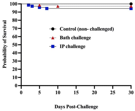 Mortality was not observed in the control (non-infected) group, in contrast, at 30 dpc, mortality in the bath and ip-challenged animals was 2.82% and 5.64%, respectively (Figure 1).