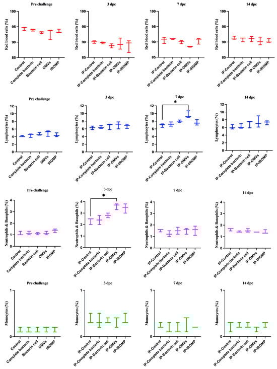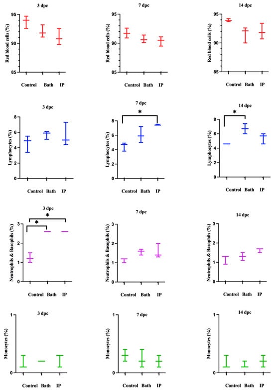 Atlantic salmon blood cell populations identified by flow cytometry at 3, 7, and 14 dpc with M. viscosa. Differences were identified using one-way ANOVA (non-parametric) followed by Kruskal–Wallis post hoc tests at each sampling point. Asterisks (*) demonstrate a significant difference between groups (p ≤ 0.05).