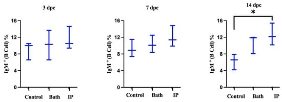 Spleen IgM+ (B cells) detected by flow cytometry in ALPHA JECT-vaccinated Atlantic salmon at 3, 7, and 14 dpc with M. viscosa. Differences were identified by performing one-way ANOVA (non-parametric) followed by Kruskal–Wallis post hoc tests. At each time point, challenged groups are compared versus control (non-infected) fish. Asterisk (*) demonstrates a significant difference (p ≤ 0.05) between groups.