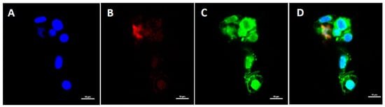 Confocal microscopy of Atlantic salmon leukocytes from the spleen. (A) Cell nuclei were stained blue with DAPI; (B) IgM+ cells with red fluorescence were visible following staining with chicken anti-salmon-IgM/IgY and avidin-Texas Red (TX-R); (C) green fluorescence indicates cells that were stained with FITC; (D) overlay of all the used colors in confocal imaging.