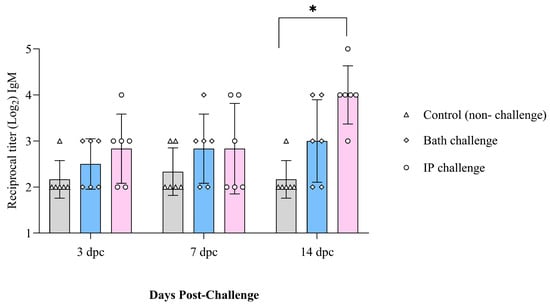 IgM titers did not change with time in the control group (non-infected) salmon. However, they were higher at 14 dpc in the ip-challenged group. Bath-challenged animals showed slightly higher IgM titers than the control group at all the examined time points. However, this difference was not significant (Figure 5).