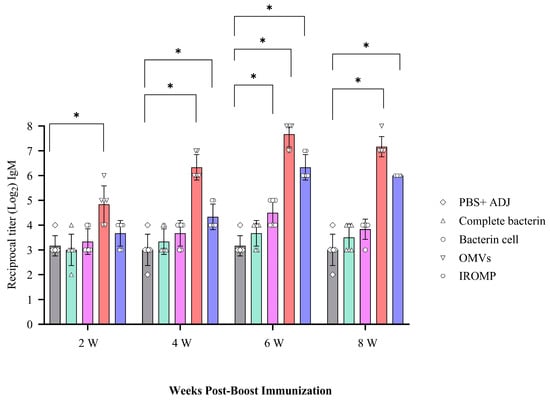 Immunized fish boosted with the OMVs vaccine had the highest IgM levels at all the examined time points, and this was significantly greater than in the control fish at all time points. In contrast, the IROMP-boosted group only had greater IgM titers at 4, 6, and 8 weeks post boost immunization compared to the non-boosted group, while that of the bacterin cell-boosted group was only higher than the control group at 6 weeks following the boost. Finally, the salmon boosted with the complete bacterin did not have IgM titers higher than those measured in the non-boosted (i.e., PBS adjuvant injected group) (Figure 6).