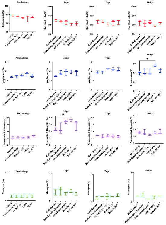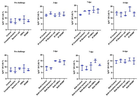 Our findings showed that neutrophils and basophils increased in the OMVs boosted group at 3 dpc (ip and bath) compared to the non-boosted one (Figure 7 and Figure 8). Furthermore, lymphocytes were statistically higher in the OMVs boosted animals compared to the non-boosted group at 7 and 14 days post ip and bath challenge, respectively. A slight rise of leukocytes was observed in other boosted groups compared to the non-boosted; however, the non-parametric test revealed no significant differences between them (Figure 7 and Figure 8). IgM+ (B cell) increased in the spleen and peaked at 14 dpc in the OMVs-boosted group but was not statistically different from non-boosted animals (Figure 9).