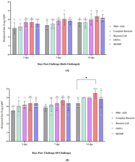 The antibody titer slightly increased from 3 to 14 days post challenge (dpc) (Figure 10A,B). The OMVs vaccine reached the highest antibody level at all the studied time points and was statistically higher at 14 dpc than the non-boosted animals (Figure 10B). The IROMP-boosted group displayed slightly higher antibody titer than the bacterin cell, complete bacterin, and control groups. However, statistical analysis indicated no significant difference between them. Antibody levels were slightly higher in the ip-challenged animals compared to the bath-challenged group. Also, no mortality was observed in the boosted animals until 30 dpc. This investigation indicated a positive correlation between survival proportions and antibody titers. All the vaccines induced the fish immune response, and the survival rate was 100% in all the treatments after the challenge (Figure S5).