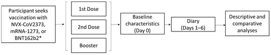 Study design for the 2019nCoV-406 study. * Participants who received vaccines other than BNT162b2, mRNA-1273, or NVX-CoV2373 were excluded from analyses due to low numbers.
