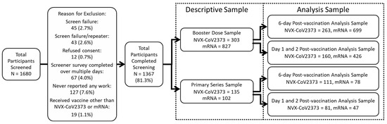 Two main subpopulations were powered for and defined in this study: the Booster Dose Population, which consisted of study participants who received any booster dose of NVX-CoV2373 or an mRNA vaccine (i.e., BNT162b2 or mRNA-1273), regardless of which vaccine was used for the prior doses and prior COVID-19 disease status, and the Primary Series Population, which consisted of study participants who received their first or second dose of NVX-CoV2373 or an mRNA vaccine, regardless of which vaccine was used for the first dose and prior COVID-19 disease status. The sample size was determined based on the ability to power the primary objective In the booster dose population, as well as the ability to have an adequate sample for the key secondary objective in the primary series population and exploratory objectives. Assuming a 1:3 NVX-CoV2373:mRNA recruitment ratio, a Booster Dose Population of ≥289 NVX-CoV2373 participants and 866 mRNA vaccine participants was targeted for enrollment to detect an absolute difference of 10% between NVX-CoV2373 (20%) and an mRNA vaccine (30%) when the primary objective was evaluated at 80% power using a two-sided Fisher’s exact test with a 0.05 significance level, including a 22% adjustment for dropout. Assuming a 1:1 NVX-CoV2373:mRNA recruitment ratio, a Primary Series Population of ≥346 participants (173 per group) was targeted for enrollment to detect a difference of 15% in the percentage of participants with work impairment between NVX-CoV2373 (20%) and an mRNA vaccine (35%) when the key secondary objective was evaluated at 80% power using a Fisher’s exact test with a 0.05 significance level, including a 15% adjustment for dropout. Because vaccine doses were treated independently, 1501 individuals were required to power the primary (Booster Dose Population) and key secondary (Primary Series Population) objectives. A total sample size of 1750 participants was deemed feasible based on practical considerations, with 249 individuals included for over-sampling to account for any increases in the dropout rate and other vaccines.