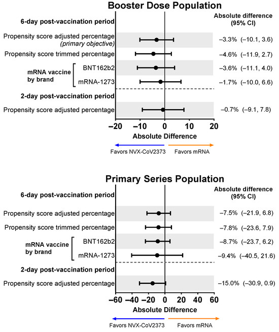 Forest plots showing estimated differences (NVX-CoV2373—mRNA) in the proportion of participants reporting overall work impairment scores of ≥50% for ≥1 day during the 6-day post-vaccination period. Results are shown for the Booster Dose and Primary Series Populations. Percentages and 95% CIs derive from a propensity score-weighted logistic regression for the comparison of the NVX-CoV2373 and mRNA vaccine groups. Note: The scales for the absolute difference differ for the Booster Dose and Primary Series Populations.