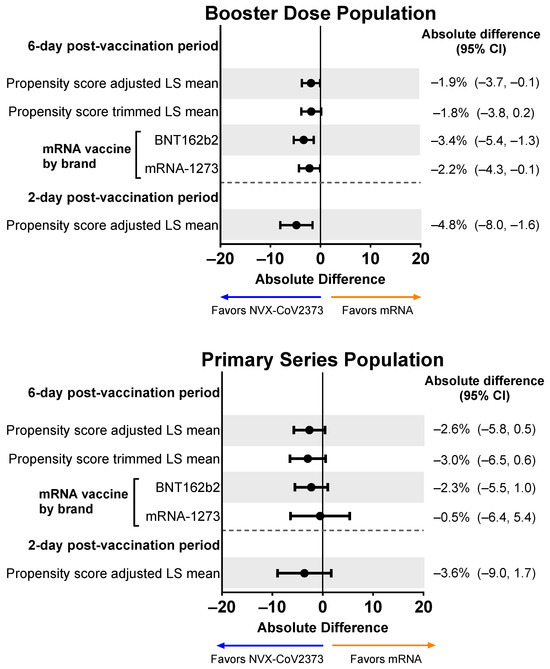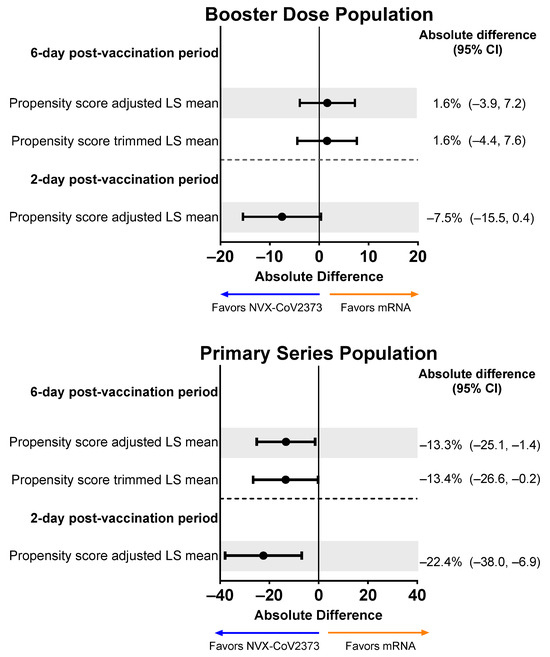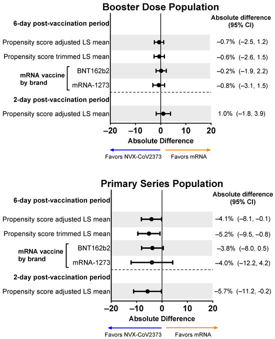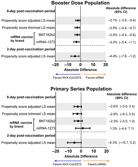 Forest plots showing estimated differences (NVX-CoV2373—mRNA) in the mean percentage of impairment while working. Results are shown for the Booster Dose and Primary Series Populations. Impairment while working was estimated by averaging the impairment scores (rated 0–10) collected from the daily diary over the post-vaccination period. LS means and 95% CIs derive from a propensity score weighted ANOVA regression for the comparison of the NVX-CoV2373 and mRNA vaccine groups. LS, least squares.