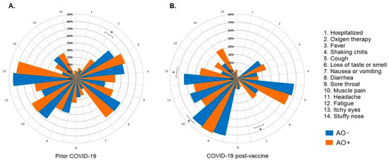 Clinical profiles by (A) prior COVID-19, (B) COVID-19 post-vaccination in all populations. Each graph shows the proportion, from 0% (center of the circular graph) to 100% (circular graph perimeter). The * p-value refers to the chi-square/Fisher’s exact test. The results were considered statistically significant when p < 0.05. Abbreviations: AO−, without abdominal obesity; AO+, with abdominal obesity.