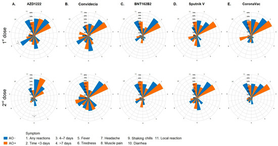 Clinical profiles by vaccination schedule in all population; (A) AZD1222, (B) Convidecia, (C) BNT162B2, (D) Sputnik V, and (E) CoronaVac. Each graph shows the proportion, from 0% (center of the circular graph) to 100% (circular graph perimeter). The * p-value refers to the chi-square/Fisher’s exact test. The results were considered statistically significant when p < 0.05. Abbreviations: AO−, without abdominal obesity; AO+, with abdominal obesity.