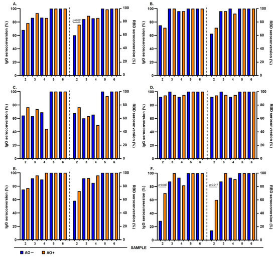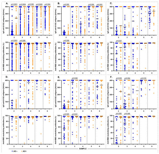 Seroconversion rates of IgG anti-S1/S2 and neutralizing anti-RBD neutralizing antibodies in AO− (blue) and AO+ (orange). Data are taken from follow-up time points: samples 2, 3, 4, 5, and 6 (21, 90, 180, 270, and 365 d, respectively). (A) Total population; participants AO+ have significantly higher anti-RBD neutralizing antibody seropositivity than AO− at 21 d. Vaccine (B) AZD1222, (C) Convidecia, (D) BNT162b2, (E) Sputnik V, and (F) CoronaVac, participants AO+ have significantly higher IgG anti-S1/S2 and anti-RBD neutralizing antibody seropositivity than AO− at 21 d. Bars medium; comparisons using the Mann–Whitney U test. The results were considered statistically significant when p < 0.05.