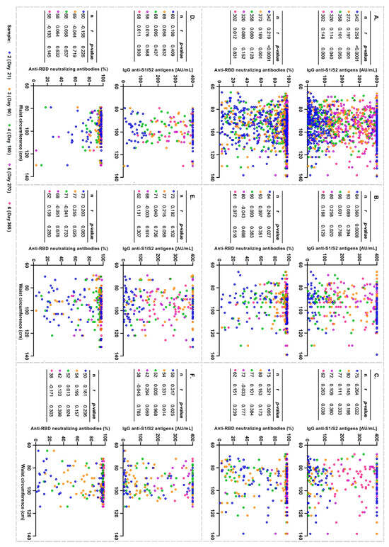 Correlation of waist circumference with the levels of anti-S1/S2 IgG antibodies and anti-RBD neutralizing antibodies induced by the vaccination scheme. Data from the three follow-up time points: sample 2, 3, 4, 5, and 6. Correlation by vaccination scheme: (A) total population, (B) AZD1222, (C) Convidecia, (D) BNT162b2, (E) Sputnik V, and (F) CoronaVac. r denotes Spearman’s correlation coefficient.