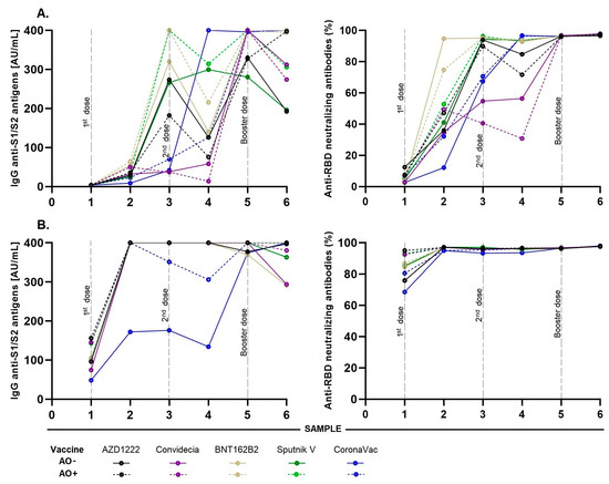 In the group with previous COVID-19, the levels of IgG anti-S1/S2 antibodies in almost all vaccines showed a rapid increase after administration of the first dose (sample 2: day 21), reaching a peak of 400 AU/mL and remaining high until the end of the study. The only exception was anti-S1/S2 IgG antibodies in the AO− participants of the CoronaVac group, where the lowest levels were obtained on day 21 (mean: 172 AU/mL), followed by sample 4 (day 180), with a median of 134 AU/mL, which presented an increase in sample 5 (day 270). For the anti-RBD-neutralizing activity, we found a considerable increase in all vaccines up to the end of the study for both the AO− and AO+ groups (Figure 6B).