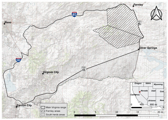 Map of Virginia Range, Nevada, USA, indicating the main Virginia Range (no fill), Fernley areas (line fill), and south herd areas (dot fill).