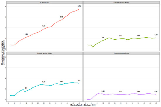 Temporal trend of mean pZP vaccinations per mature mare at monthly intervals across 48 months. Annotated labels show 12-month interval values. Panels indicate estimated variability of the vaccine efficacy period from no loss (top-left panel) through to an efficacy period of 6 months (bottom-right panel).