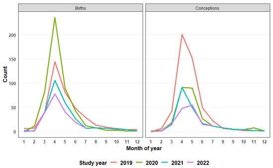 The number of foal births recorded by month and year (2019–2022) and with this number applied as proxy for conceptions in the previous year (assuming 354 days gestation) in mature mares.