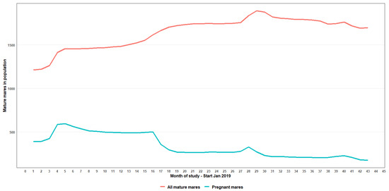 The seasonal response of foal births (Figure 3) showed that subsequent to the increased rate recorded in 2020, there was a decline both in the peaks and, notably, a steady but marked temporal contraction year-on-year in this pattern. Additionally, no apparent widening of foaling season or shift in peak foaling season was observed (Figure 3). When foal births were used as a proxy for conceptions, in 2019, 488 mares conceived, comprising 31.9% of the mature mare population, and thereafter the proportion of mares conceiving year-on-year was more than halved to 14.9% (2020) and 10.3% in 2022 (Table 1, Table 3). The trend of total mares in the population along with their pregnancy status is shown in Figure 4. Even with improved observation resulting in an increase in the total mares reaching a peak in month 29 of the study, there was a decrease in the numbers of pregnant mares across the study period, with the trend still decreasing at the analysis end point of 48 months. The number of pregnant mares peaked in month 5 (n = 551) and sharply declined 67% by month 43 (n = 173). In addition, data showed a shallow but decreasing (10%) trend of total females in the population, commencing from month 29 of the study.