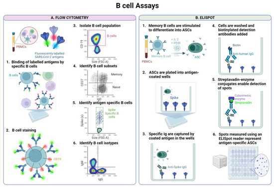 - Rouers, A.; Tay, M.Z.; Ng, L.F.P.; Renia, L. B-cell ELISpot assay to analyze human memory B cell and plasmablast responses specific to SARS-CoV-2 receptor-binding domain. STAR Protoc. 2023, 4, 102130. [Google Scholar] [CrossRef]