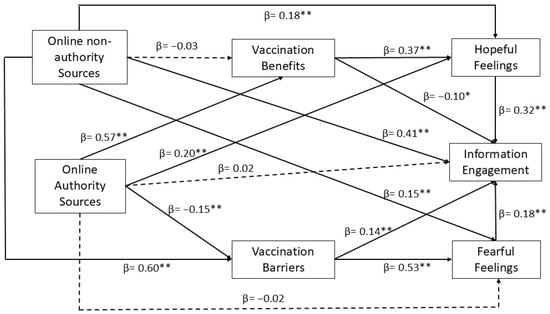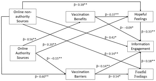 As the literature has suggested that online authority sources that disseminate scientific facts about vaccines is related to an individual’s confidence in vaccination, e.g., [,], it is anticipated that exposure to these sources will be related to greater perceived vaccination benefits and lower perceived vaccination barriers. The following hypotheses are posited to test these assertions.