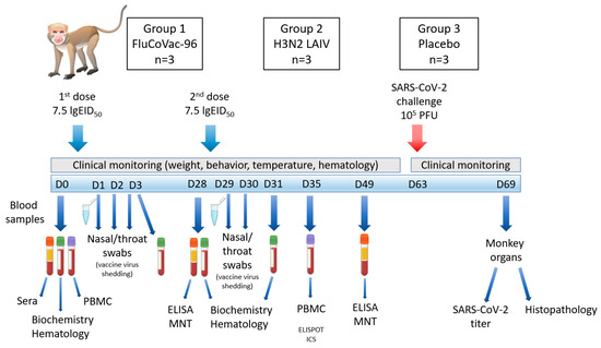 The scheme of the experiment on assessment of safety and immunogenicity of the FluCoVac-96 in rhesus monkeys. D—days of the experiment; PBMCs—peripheral blood mononuclear cells; MNT—virus microneutralization test; ICS—intracellular cytokine staining.