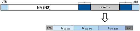 The scheme of modified NA segment of the FluCoVac-96 and the SARS-CoV-2 cassette insertion. UTR—untranslated regions of influenza NA segment; P2A—sequence encoding self-cleaving site of porcine teschovirus-1; N, S—SARS-CoV-2 proteins, the amino acid residues are listed in subscript; Stop—3 stop-codons at the end of the cassette. The additional fragment of NA sequence is shown in blue.