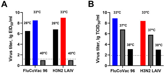 Replication of FluCoVac-96 and control H3N2 LAIV strain in chicken embryos and MDCK cells. (A) Reproduction in eggs at different temperatures; (B) reproduction in MDCK cells at different temperatures.