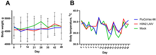 Nine male rhesus macaques, 2 to 7 years of age, were included in the experiment. Before the start of the experiment, the animals were examined for health status, and their weight and temperature were measured. For this preclinical study in monkeys, we selected a vaccine dose similar to the human dose of seasonal LAIV based on Len/17 MDV [57]. Licensed vaccines contain not less than 7 lg EID50 of each Flu A component [57,58], so to follow safety in this primate model, 7.5 lg EID50 was used. Three monkeys from each group received two doses of either FluCoVac-96 or H3N2 LAIV, 107.5 EID50 each, four weeks apart. The control group was immunized with a placebo (allantoic fluid). The health status and clinical assessment of animals were monitored during the immunization phase (days 0–49), and no significant changes were observed in the clinical status of vaccinated animals, including food consumption and appetite. Several animals in all study groups showed a slight decrease in body weight from baseline values, which was most likely a consequence of stress (Figure 4A). Throughout the entire observation period, the body temperature of experimental animals of all groups remained at the level of normal values; changes in the average temperature of animals in the groups did not exceed 0.8 °C, and no significant differences between groups at all time points were detected (Figure 4B).