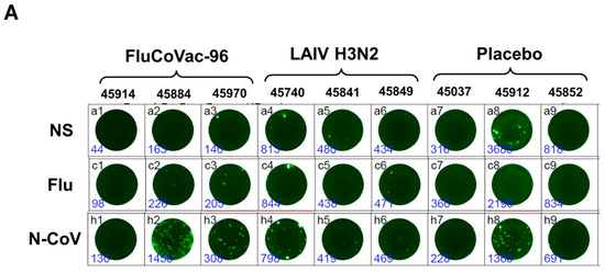 Virus-specific interferon-gamma (IFNγ)-secreting cells were counted in PBMCs of immunized monkeys on day 35 (7 days after the booster dose) of the experiment. The cells were isolated with Ficoll gradient (described in [43]), and live cells were counted with TC-20 automatic cell counter (BioRad, Hercules, CA, USA). The 500 000 cells in 100 µL/well were stimulated with sucrose-purified influenza virus (2 MOI) or recombinant SARS-CoV-2 N protein (2 µg/mL). The mixtures were added to the plate of FluoroSpot Plus: Human IFN-γ/TNF-α (Mabtech, Hamburg, Germany) kit and incubated for 18 h at 37 °C, 5% CO2. Detection of spots was performed according to the manufacturer’s protocol. Spots were counted with AID vSpot Spectrum (Advanced Imaging Devices GmbH, Strassberg, Germany).