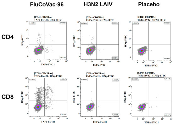 The summarized data on the levels of cytokine-producing memory T cells prior to immunization and 7 days after the boost dose are shown in Figure 9. Both CD4+ and CD8+ influenza-specific CD45RA- cells were detected at higher levels in the FluCoVac-96-immunized group than in the H3N2 LAIV immunized group (Figure 9A,B and Figure 10). This is consistent with our previous findings: the incorporation of foreign T-cell epitopes into the genome of influenza vaccine strains leads to an enhancement of the immunogenicity of the strain to influenza virus [61]. Representative gates are shown in Figure 11, and the CD45RA- cells, producing IFNγ, TNFα or both cytokines are gated on the plots. The most pronounced T-cell response was seen in monkey №45884, which had elevated antibody titers to influenza virus and in which virus shedding was observed. In the PBMCs of animal №45884, we also detected the presence of polyfunctional memory T cells (IFNγ + TNFα + IL-2+) (Figure 12). The presence of cells with this phenotype is a marker for the formation of a long-lived memory T-cell population that can respond rapidly to pathogen reinvasion [64,65]. Cells with this phenotype are extremely rare in peripheral blood samples [64].