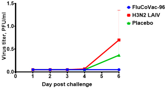 The results of the hematological analysis are shown in Tables S2–S4. In the group immunized with FluCoVac-96, the level of hemoglobin and the number of basophils were decreased on D3 compared to D0, and then the levels returned to the original values on D28. In this group, significant differences were also observed in the percentage of monocytes on day 28, while the indicators remained within the reference values. In the group of monkeys that received the control H3N2 LAIV, there were significant differences in red blood cell counts, hemoglobin and hematocrit on day 28 compared to day 3. However, similar changes in these parameters were also found in mock-immunized monkeys, suggesting that these changes were not a consequence of drug administration but were due to changes in individual animals during their care. There were also no statistically significant differences between any of the three groups.