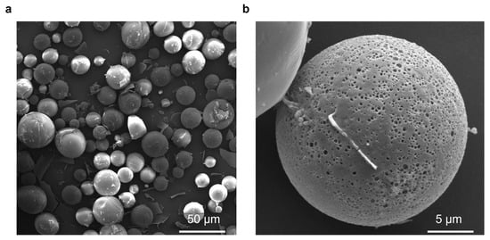 Morphology of the PLGA microsphere. The surface morphology of the PLGA-OMP16 microspheres was visualized using a scanning electron microscope to confirm their spherical structure. The microspheres were found to be spherical and smooth with a size ranging from 10 to 50 μm (a). Additionally, small holes distributed on the surface of the microspheres were observed (b).