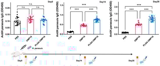 Anti-OMP16 IgG titer in serum after immunization. The serums from the anti-H. parasuis IgG profiles of the mice immunized with various formulations were assessed. The values are presented as the mean ± standard deviation (n = 18), and the serum samples were collected on days 0, 14, and 28. The statistical significances are denoted by n.s., p > 0.05, ***, p < 0.001.