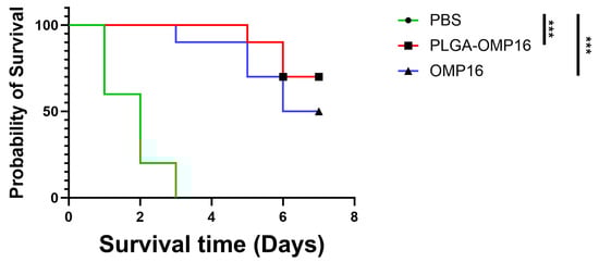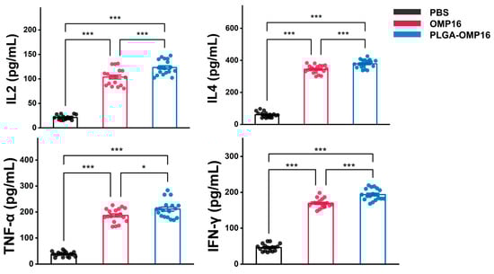 At 14 days post booster immunization, the spleens were collected from three mice in each experimental group for cytokine analysis. The results showed a significant elevation in the concentrations of IL-4, IL-2, IFN-γ, and TNF-α in the PLGA-OMP16 group compared to the other groups (p < 0.001) (Figure 4).