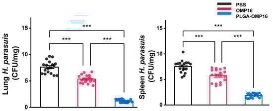 The bacterial loads in the spleen and lungs of the mice at 24 h post-infection were assessed to evaluate the clearance of H. parasuis. To confirm the presence of Haemophilus parasuis, three colonies from each plate were selected for PCR identification. The results demonstrated a significantly lower bacterial count in the PLGA-OMP16 group compared to the OMP16 group (p < 0.001) (Figure 6).