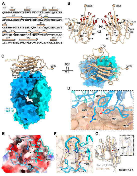 Initial attempts to crystallize the gE_FcBD:5A2 Fab complex resulted in a protein crystal with high mosaicity that diffracted X-rays to a maximum resolution of 4.3 Å. This structure was solved by molecular replacement using the gE_FcBD homology model and a model of the 5A2 Fab as search template models. Visible electron density extended from the gE_FcBD N-terminal residue Gln305 through to residue Phe479 and covered the majority of Fab 5A2 (Figure 2A–F and Figure S4A). Despite the relatively low resolution, the electron density was sufficient for placing main chain and side chain residues, particularly at the antibody–antigen interface (Figure S4A). The structured C-terminal domain of gE was virtually structurally identical to the reported X-ray structure for HSV1-gE (PDB 2GIY), with a room mean square deviation of 1.9 Å across 175 Cα atoms (Figure 2G). The overall fold for this domain consists of thirteen beta-strands (named here as β1′–β13′) organized into three beta-sheets, two of which pack in the center and form an Ig variable-like fold (Figure 2A,B). Three naturally occurring disulfide bonds, which are also conserved in HSV1 gE, are located between residues C357:C383, C366:C375, and C402:C412. Overall, the high conservation of the FcBD between VZV and HSV-1 underscores the potentially shared function.