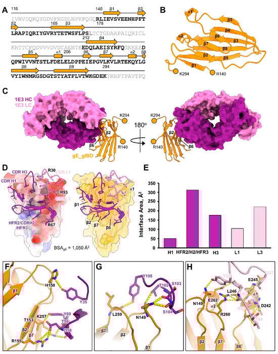 Structure of gE_gIBD in complex with Fab 1E3. (A) Sequence for the gE_gIBD construct. Residues that are visible in the electron density maps are colored black. Residues involved in β-strands and α-helices are indicated with orange arrows or tubes, respectively. (B) X-ray structure of the gE_gIBD shown in cartoon representation with β-strands and α-helices labeled. The N- and C-terminus residues are also indicated. (C) Two views of the gE_gIBD structure shown in complex with Fab 1E3, which is displayed in surface representation. (D) The gE_FcBD is shown with surface charge potential (left) or with transparent surface and cartoon (right). The 1E3 heavy- and light-chain CDRs and heavy-chain FRs that contact gE are shown in cartoon, with select residues shown as sticks to illustrate shape and charge complementarity. (E) Graph showing BSA for 1E3 CDRs. (F) Hydrogen bond interactions between gE and the 1E3 heavy chain CDRs 1 and 2 or (G) CDR H3. (H) Hydrogen bonds between gE and the 1E3 light chain.