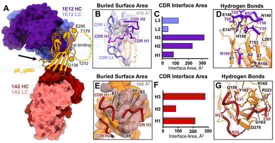 Epitope mapping of the gE_gIBD. (A) X-ray structure of the gE_gIBD in ternary complex with Fabs 1A2 and 1E12, which are shown in surface and colored as labeled in the panel. The black arrow indicates a loop on gE_gIBD, which was not resolved in the 1A2-bound structure. The residues forming the gIBD are depicted with a dashed yellow line. (B) The 1E12 CDRs that contact gE are shown in cartoon tubes and sticks and the BSA on gE is shown in transparent surface. (C) Graph indicating the 1E12 CDR interface areas on gE. (D) Hydrogen bond interactions between gE and Fab 1E12. (E) The 1A2 CDRs that bury surface on gE are shown as cartoon tubes and gE is shown in transparent surface with the regions buried by 1A2 shaded dark. (F) Graph indicating the 1A2 CDR interface areas on gE. (G) Hydrogen bond interactions between gE and Fab 1A2.