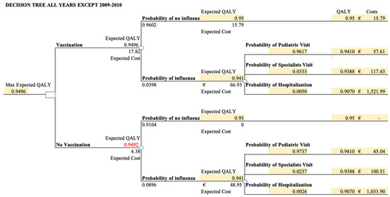 We first show in Figure 1 the distribution of total observed costs incurred due to an influenza episode by the patient pathway, vaccination status, and across influenza seasons. We notice that for most influenza seasons, there are no hospitalization costs given the effectiveness of the vaccine, but the average cost of pediatrician and specialist visits remains similar across vaccinated and unvaccinated children. After incorporating the probabilities of patient pathways, we derived the expected total influenza costs per patient for vaccinated children at around EUR 17.82 (including vaccination estimated to be equal to EUR 15.79), while the expected total influenza costs for unvaccinated children are around EUR 4.39 (Table 2). The mean cost and the probabilities of each patient pathway are further inputted into the decision tree for each season for the calculation of incremental values. In Figure 2, we illustrate a sample decision tree for the values obtained for the 2017–2018 season.