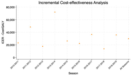 For the primary outcomes for our CEA, we calculated the ICERs per QALY gained for each season to understand the cost and effectiveness trade-off for the vaccination program. As seen in Figure 3, the average ICER for matched seasons is estimated to be around EUR 29.831 per QALY, and varies greatly across season, from EUR 13,736 in 2017/2018 to EUR 72,153 in 2013/2014. We also estimated the cost per influenza case averted using the previous study on vaccine effectiveness, which was around EUR 23 per case, with some fluctuations across the years. Figure 3 visualizes the ICERs across all seasons except 2009–2010. From the healthcare system’s perspective, the inclusion of pediatric vaccination is expected to incur higher direct costs but remain cost-effective to the threshold of EUR 40,000 per QALY for most of the observed period. The exact values of ICERs can be found in Supplementary Materials Table S4.