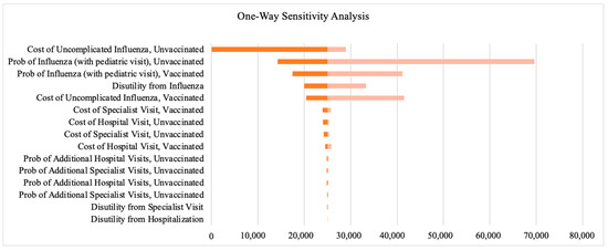 For the sensitivity analysis, we first assessed how different factors affect the ICER values, keeping everything else constant. The tornado graph (Figure 4) shows that ICER is most sensitive to the direct costs of treating unvaccinated influenza cases, followed by vaccine effectiveness and disutility derived from influenza.