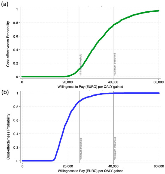 We developed both a one-way deterministic sensitivity analysis (DSA) as well as a probabilistic sensitivity analysis (PSA) from the healthcare provider’s perspective to test how the cost-effectiveness of testing varies according to parameter changes. For the DSA, we vary the probability parameters by 25% to assess how sensitive our ICER values are to the estimated values. Using a total of 1000 Monte Carlo simulations, we varied the QALY (beta distribution) and cost (gamma distribution) to generate the cost-effectiveness acceptability curve (CEAC), which presents the probability of being cost-effective over the different thresholds. The CEAC is compared with the maximum willingness-to-pay (WTP). The WTP per year of life lost is a theoretical maximum price that a healthcare system is willing to pay to prevent the loss of one year of quality-adjusted life. Health economists have conducted studies to infer that in Italy the willingness to pay threshold is between EUR 25,000 (minimum) and EUR 40,000 (maximum) [33]. The DSA is performed on Excel, while the PSA is computed using STATA 17.