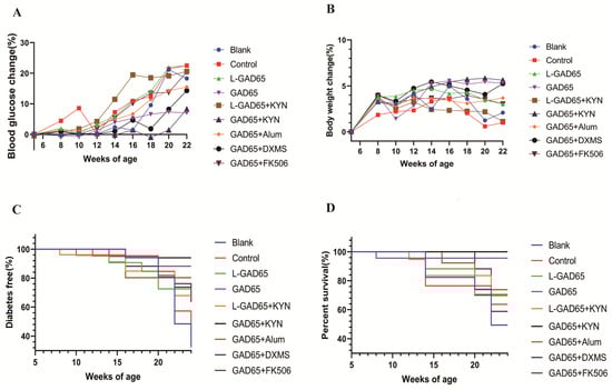 | GAD65 + KYN | 10 | 100 μL (1 × 1011 pfu/mL) | KYN (200 μg) | 2 | |