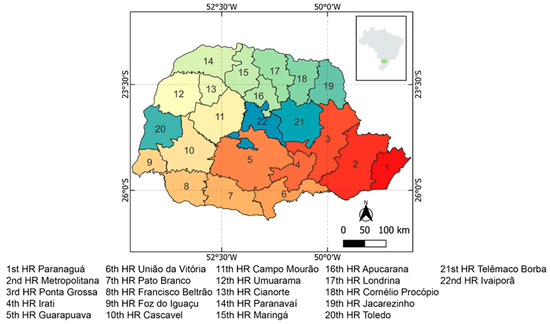 The study included adolescents aged 9 to 14 years who were immunized with the quadrivalent HPV vaccine in the state of Paraná between 2015 and 2022. The state of Paraná has a total population of 11,444,380 distributed over a territorial area of 199,298.981 km2, according to the Brazilian Institute of Geography and Research (IBGE) [22]. It is one of the states in Brazil with the best Human Development Index (HDI) (0.749) (IPARDES, 2019). It is divided into 22 health region grouped by municipalities to facilitate the organization of health services offered to the population [23] (Figure 1).