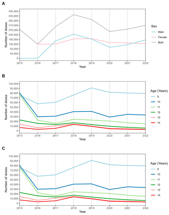 Temporal evolution of the number of doses administered in Paraná between 2015 and 2022. In (A) by sex (Male, Female, and Both sexes), (B) by age group (9 to 14 years) for females, and (C) by age group (9 to 14 years) for males.