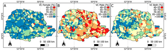 This method has been widely used in epidemiological studies of infectious diseases to investigate the spatial determinants of a given disease [33,34,35]. This analysis was performed for vaccination coverage separately for females, males, and both, and subsequently the model with the best performance was evaluated by considering the highest R2 and Akaike information criterion (AIC). In addition, bandwidth was configured to adapt to the GWR, following the Gauss distribution on the geographical weighting function, and the default method for drop-1 cross-validation. Four independent variables entered the regression analysis: municipal performance, educational performance, family health strategy coverage, and primary care coverage.