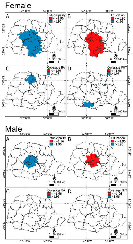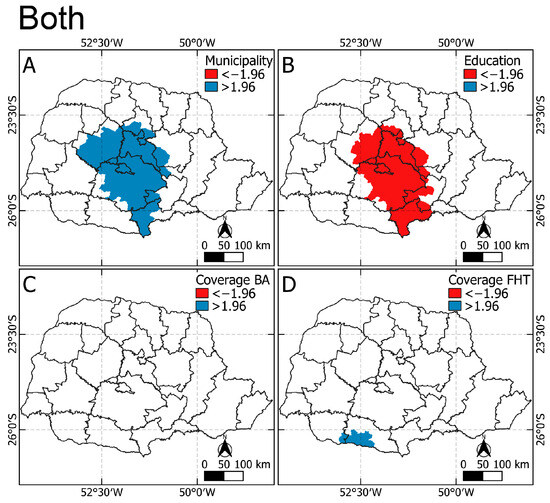 Figure 4 shows the municipalities with significant results (t < −1.96 or t > 1.96). For the interpretation of this analysis, the values in blue represent t values > 1.96, which means that there was a significant and direct relationship, i.e., the higher the values of the independent variables, the higher the value of the outcome variable. The red colors represent t values < −1.96 and presented a significant inverse relationship, meaning the lower the value of the independent variable, the higher the value of the outcome variable. In this sense, the municipal performance variable was significant (t > 1.96) for increasing vaccination coverage for girls, boys, and both sexes who were closer to regions 4, 5, 6, 7, 11, and 15. The family strategy coverage variable was significant for girls and both sexes surrounding regions 7, 8, and 21. The education variable was inversely significant for girls, boys and both sexes in cities closer to regions 4, 5, 6, 11, 21, and 22. Primary care coverage was not significant for boys or both sexes.