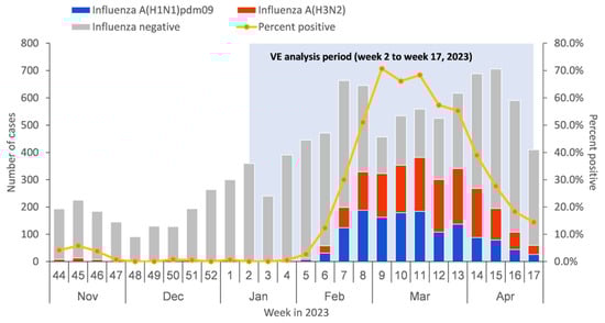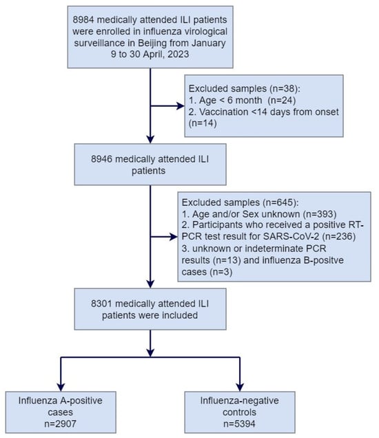 The test-negative case–control study design was adopted to assess VE against influenza A-associated influenza-like illness (ILI) in outpatient and emergency department visits, details of which have been described previously [,]. In summary, epidemiological information and specimens of participants were collected through the influenza virological surveillance system managed by the Beijing Center for Disease Prevention and Control (BJCDC), which consisted of 23 sentinel hospitals and 17 collaborating laboratories in the 2022–2023 influenza season. Under this system, ten to twenty pharyngeal swab specimens of medically attended ILI cases were collected by healthcare workers in outpatient settings (including internal medicine, pediatric clinic, and fever clinic) and emergency department in each sentinel hospital per week. We defined ILI as having a fever ≥38.0 °C with cough or sore throat. Samples of ILI patients who visited within 3 days after the onset were priority collected. The specimens were transported to collaborating laboratories in viral transport medium at 4 °C for nucleic acid detection of influenza virus and SARS-CoV-2 by reverse transcription polymerase chain reaction (RT-PCR). SARS-CoV-2-positive cases (including co-infections with influenza), as well as a small number of influenza B-positive cases, were excluded from the analysis.